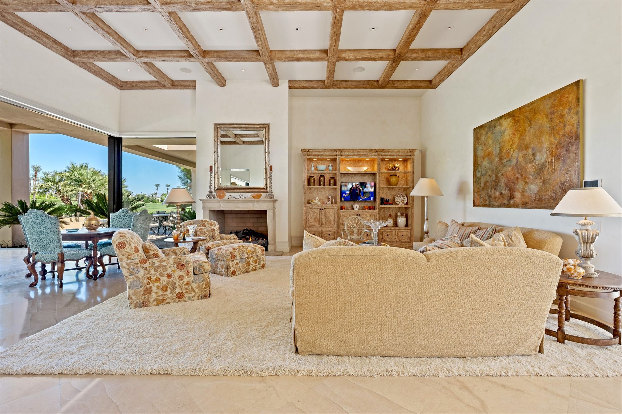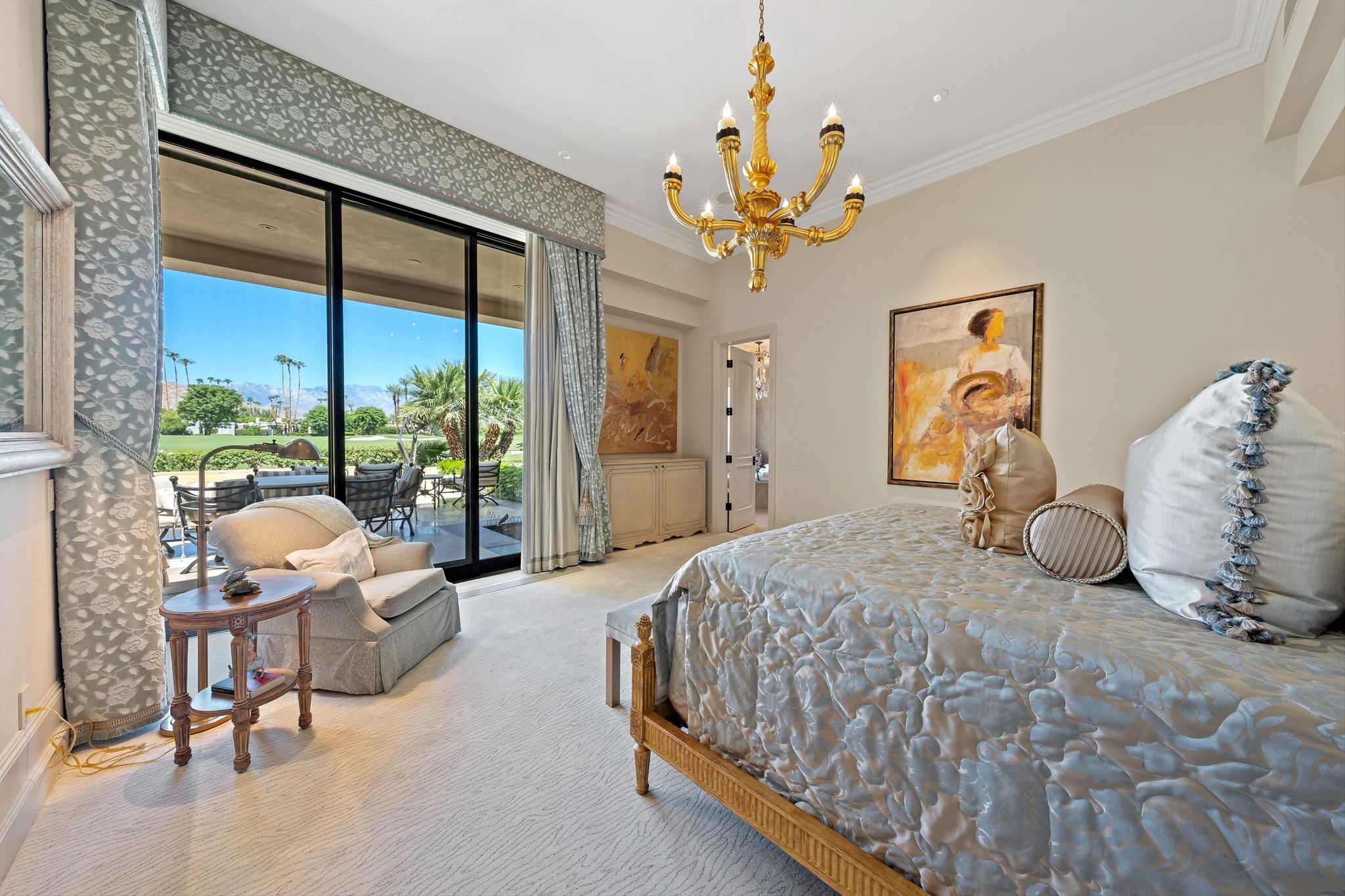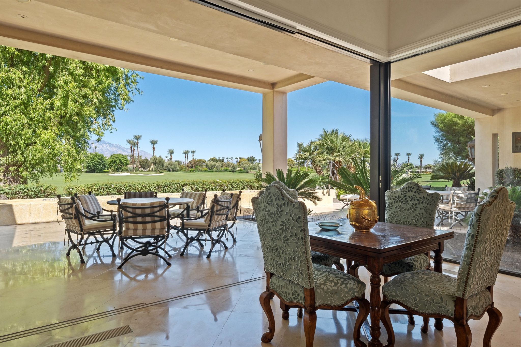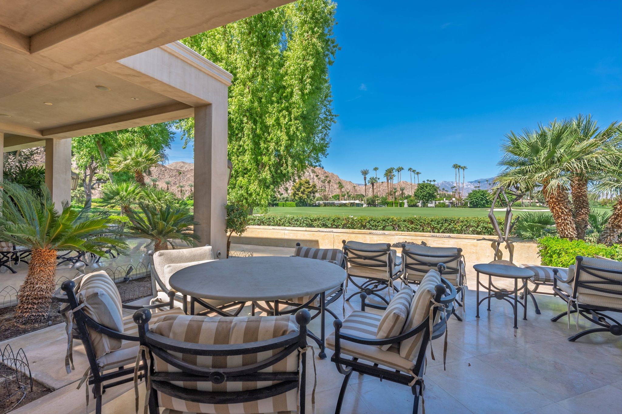This stunning property, built in 2007, boasts an impressive 5,452 sq. ft. of exquisite living space on a generous 16,988 sq. ft. lot, perfectly positioned on the picturesque 18th fairway.As you arrive you are greeted by the sound of a tranquil fountain in the entry courtyard, surrounded by the dramatic… Read MoreSanta Rosa foothills. Step into the heart of this home – a gourmet kitchen designed for both culinary enthusiasts and entertaining connoisseurs. Adorned with custom cabinetry and luxurious Taj Mahal Quartzite countertops, this space features top-of-the-line Dacor appliances, including a 6-burner gas cooktop, dual ovens, and two Miele dishwashers, encouraging effortless meal preparation and entertaining. The kitchen also includes two SubZero refrigerator doors with four freezer drawers, a double stainless steel sink, an additional island sink, and a walk-in pantry – a perfect blend of style and function. Custom Fleetwood disappearing pocket doors bring the outside in from the family room area with jaw dropping views of Mount San Jacinto over manicured fairways.The formal living room, characterized by a stunning wood beam ceiling, exudes sophistication with its inviting cut limestone fireplace and Fleetwood disappearing sliding doors that seamlessly integrate indoor and outdoor living. Venetian plaster walls elegantly showcase throughout this home, providing an opulent backdrop for gatherings and celebrations. A chic, well-appointed wet bar with a wine refrigerator and ice maker make entertaining simple.This remarkable home features a total of five beautifully appointed bedrooms, each providing a unique oasis for relaxation. The master suite offers breathtaking views of the San Jacinto mountains and fairway, complete with an extravagant en-suite bathroom featuring glistening abalone tile walls, double sinks, a spacious walk-in shower, a sumptuous soaking tub, and generous walk-in closet & storage.Each guest bedroom comes with its own en-suite bathroom, adorned with travertine counters and showers, ensuring maximum comfort and privacy for family and guests. Noteworthy are the serene views from the North Guest Bedroom and South Guest Bedroom, with picturesque panoramas of the golf course and mountains. One of the two Guest Bedrooms on the East side of this home is ideally situated to function as an additional family space or home office.This property leaves no stone unturned, featuring a spacious laundry room with granite countertops and ample storage. A stylish private powder bathroom adorned with glass tile and travertine flooring. The Creston smart home system offers cutting-edge technology to elevate your living experience, ensuring complete control over lighting, climate, and security.Live among the beauty of nature and the elegance of luxury design within the secure, serene surroundings of Eldorado Country Club. This remarkable property is more than just a home; it is an extraordinary lifestyle awaiting its new owner. Schedule your private tour today and discover the unmatched beauty and elegance of this exquisite estate!CLICK HERE TO VIEW PHOTOS & VIDEO TOURRead Less